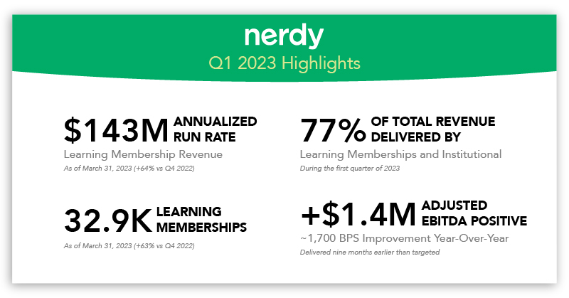 Revenue Outperforms Guidance – In the first quarter, Nerdy delivered revenue of $49.2 million, above the top end of our guidance range of $45-47 million, and represented an increase of 5% from $46.9 million during the same period in 2022. Revenue growth was driven by the continued evolution towards ‘always on’ recurring revenue products, strong adoption of Learning Memberships, lifetime value expansion, and a return to year-over-year growth in our Consumer business (having exited the J-Curve) coupled with the continued scaling of our Institutional business.