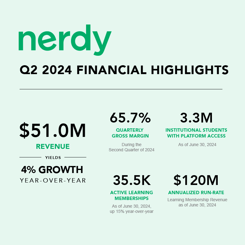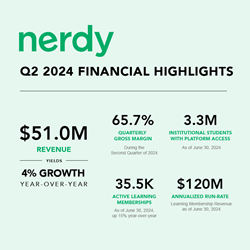Nerdy Inc. (NYSE: NRDY) today announced financial results for the second quarter ended June 30, 2024.
